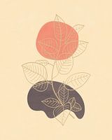 Abstract minimalistisch landschap met een tak met bladeren en twee natuurlijke vormen. De tak is met inkt getekend, de rest van de illustratie is met aquarelverf geschilderd met een zichtbare textuur.