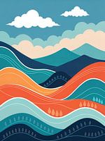 Deze levendige, abstracte illustratie heeft een gelaagd landschap met glooiende heuvels in blauw-, oranje- en groenblauwe tinten, die doen denken aan een retro vectorkunststijl. Witte contouren omlijnen de organische golfachtige vormen van de heuvels, terwijl gestileerde bomen en waterdruppels subtiele details toevoegen. De lucht erboven is rustgevend blauw, bezaaid met zachte witte wolken, wat bijdraagt aan een algehele serene en artistieke stemming.