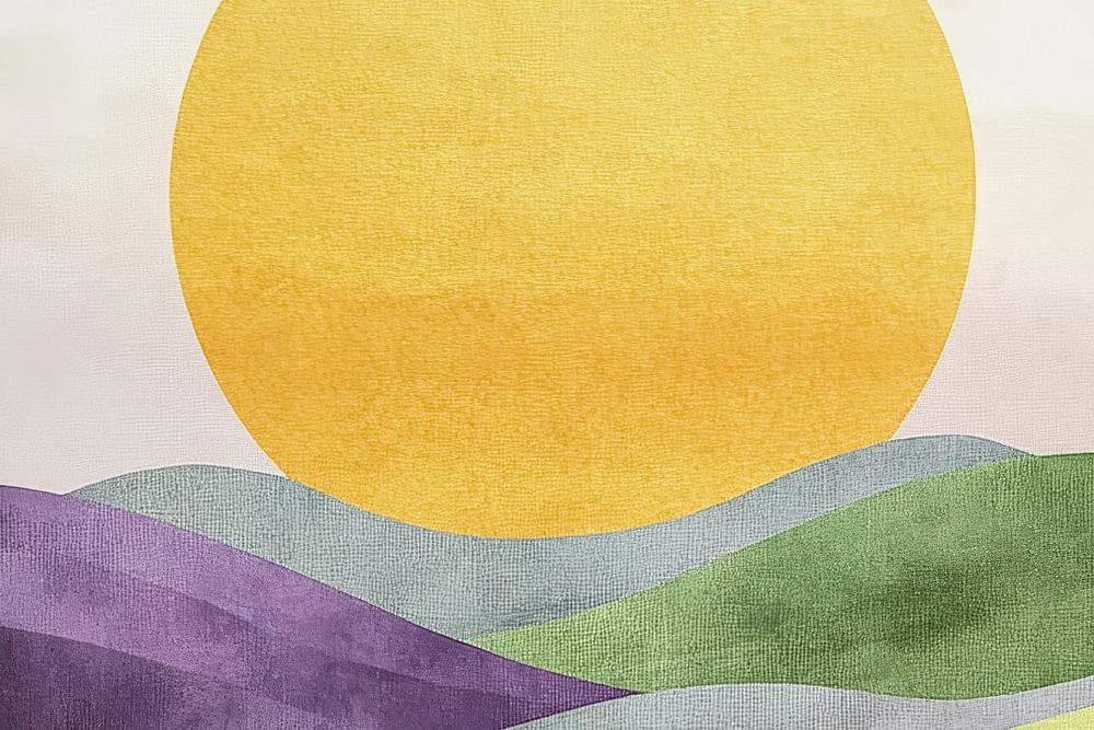 Zachte heuvels in rustgevende groentinten omarmen een stralende, gele bol zonneschijn die de horizon verlicht. De zachte schaduwen geven een gevoel van vrede en sereniteit. Ideaal voor in de woonkamer om een ontspannen sfeer te creëren die uitnodigt tot rust en de zintuigen streelt. Een perfecte blikvanger voor ontspannen gesprekken.