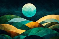 Zachte heuvels in harmonieuze groentinten, afgewisseld met gouden accenten, creëren een kalme sfeer. De grote, stralende maan voegt een gevoel van ruimte toe waardoor de kamer uitnodigend aanvoelt. Deze tijdloze compositie is perfect voor de slaapkamer om ontspannen nachten en zoete dromen te bevorderen.