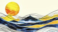 Dit abstracte, minimalistische kunstwerk toont een levendig landschap met een stralende zon boven gestileerde bergen. De vormen zijn gereduceerd en modern, met sterke kleuren en heldere lijnen die de scène domineren. De bergen zijn afgebeeld in eenvoudige geometrische vormen, terwijl de zon schijnt als een heldere, intense cirkel in de lucht. De minimalistische benadering, gecombineerd met de felle kleuren, creëert een dynamische maar harmonieuze compositie. Deze moderne interpretatie van een klassiek landschap biedt een fris perspectief dat zowel rust als energie uitstraalt. De combinatie van eenvoud en levendige kleuren maakt dit werk tot een eigentijds hoogtepunt dat ideaal is voor liefhebbers van moderne, abstracte kunst.