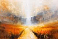Dit prachtige abstracte kunstwerk toont een betoverend landschap waar een pad door een uitgestrekt veld leidt naar een schitterende waterval in de verte. De warme tinten van geel en oranje, gecombineerd met het serene blauw en grijs, creëren een harmonieuze compositie die zowel rustgevend als inspirerend is. Perfect voor in de woonkamer of keuken, dit schilderij voegt een vleugje moderne elegantie toe aan elk interieur. De gedetailleerde penseelstreken en het spel van licht en schaduw zorgen ervoor dat je telkens nieuwe details ontdekt. Ideaal voor liefhebbers van abstracte kunst en natuurlijke schoonheid.