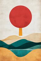 Een stralende rode cirkel zweeft majestueus boven glooiende heuvels in warme aardetinten. Het duidelijke contrast tussen de gloeiende bol van zonlicht en de gebogen, blauwe landschappen creëert een harmonieus evenwicht. Het minimalistische ontwerp nodigt uit om te dromen en creëert een kalme maar krachtige sfeer die doet denken aan…