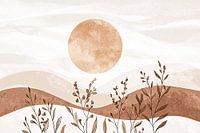 Dit serene ontwerp brengt rust in elke ruimte. De zachte aardetinten en organische vormen creëren een harmonieuze uitstraling die perfect past bij moderne en minimalistische interieurs. Het beeld toont een abstract landschap met subtiele details van planten en een centrale zon die warmte en balans toevoegt. Ideaal als wanddecoratie in de woonkamer, slaapkamer of hal. Dit unieke ontwerp straalt tijdloze elegantie uit en is een prachtige keuze voor wie houdt van natuurlijke elementen in huis.