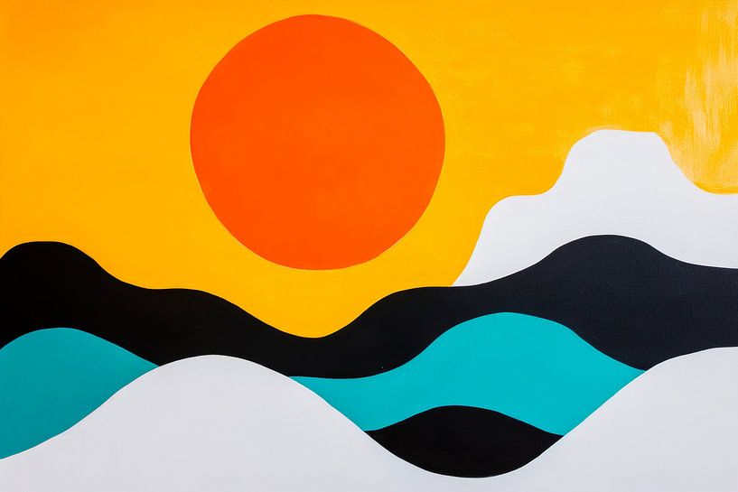 Een feloranje bol van zonneschijn nestelt zich harmonieus tegen de felgele achtergrond van de lucht en benadrukt de zachte, gebogen golven in kalmerend turquoise en diepzwart. Deze levendige kleurencompositie brengt frisheid en energie in elke keuken of eethoek en nodigt uit tot gezellige momenten.