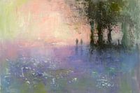 Dit abstracte schilderij toont een serene en dromerige scène van een landschap in de lente. Het gebruik van zachte pastelkleuren zoals lila, roze, groen en blauw draagt bij aan de etherische kwaliteit van het kunstwerk. De combinatie van penseelstreken en het mengen van kleuren direct op het canvas, resulteert in een wazig, impressionistisch effect. De silhouetten van twee mensen reflecteren in het water.