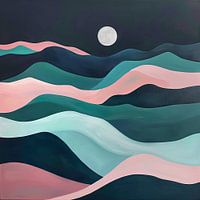 Dit abstracte schilderij legt de vredige schoonheid van een nachtelijk landschap vast, verlicht door een gloeiende volle maan. Zachte heuvels in pastelkleuren harmoniëren met diepe, nachtelijke blauw- en groentinten, waardoor een kalme en rustgevende sfeer ontstaat. De vloeiende lijnen en zachte kleurovergangen geven het werk een…