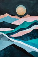 Dit abstracte schilderij legt de vredige schoonheid van een nachtelijk landschap vast, verlicht door een gloeiende volle maan. Zachte heuvels in pastelkleuren harmoniëren met diepe, nachtelijke blauw- en groentinten, waardoor een kalme en rustgevende sfeer ontstaat. De vloeiende lijnen en zachte kleurovergangen geven het werk een…
