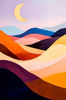 Zachte golven van organische kleuren omhullen de kijker, terwijl een mysterieuze maan boven de harmonieuze heuvels zweeft. Deze compositie straalt rust en inspiratie uit en is ideaal voor een slaapkamer, waar het een ontspannen sfeer creëert en dromerige gedachten stimuleert.