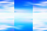 Een surrealistische licht blauwe abstracte zeegezicht. Een abstract beeld van een geblokte zeegezicht of misschien zelfs twee verschillende scènes. Een heldere, warme dag op zee. Een groen eiland is net te zien in de verte aan de horizon. Blue golfde water en een blauwe hemel met enkele wolken vegen van de hemel.