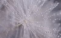 "Abstract lijnenspel in grijstinten" is een (extreme) macrofoto van een pluisje aan een paardenbloem met waterdruppeltjes erop.