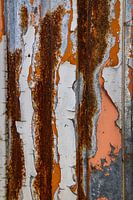 Op een metalen ondergrond bladdert de verf af. De kleuren roestbrui, wit, grijs en roze spelen mooi met elkaar samen. Deze afbeelding kan bekeken worden in horizontale of verticale stand.
