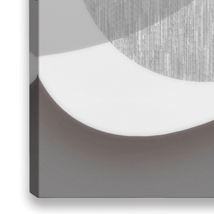 Een modern digitaal abstract met een rode cirkel erin verwerkt. Er is schaduw waardoor er een indruk van 3d ontstaat. Door de monochrome cirkels springt de rode kleur er echt uit, hoewel hij onder de rest van de figuren lijkt te zitten. Een leuk contrast.