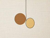 Op linnen twee cirkel vormen verbonden met zwart textiel draad beeld. Rustige kleuren in beige, bruin en warm geel. Geinspeerd door de moderne, abstracte en minimalisme woonstijl.