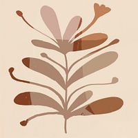 Bloem. Botanische illustratie in retrostijl in wit op roestbruin grijsDina Dankers Japandi. Abstract landschap met gouden zon en vogels op Japans patroon in okergeelDina Dankers