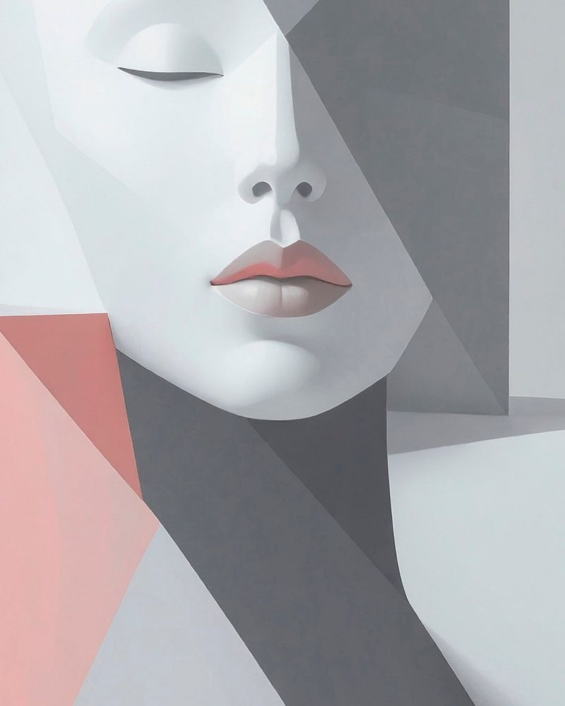 Een gezicht van een vrouw, gaat op in kubussen, gesloten ogen en droomt van zachte kleuren. Het beeld is met behulp van ai gegenereerd.