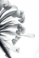 Een betoverende monochrome bloemencompositie van de Kaukasische voorjaarszonnebloem (Doronicum orientale 'Magnificum') legt de delicate fijne kneepjes van de natuur vast. Zwart-wit tinten tonen de prachtige details van de gekrulde bloemblaadjes tegen een zacht wazige witte achtergrond. De abstracte close-up details en schetsmatige kwaliteiten creëren een intrigerend botanisch kunstwerk.
