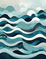 Dit fascinerende kunstwerk is een gestileerde en abstracte interpretatie van oceaangolven. De kunstenaar gebruikt een harmonieus palet van blauw, groenblauw en wit, gecombineerd met ingewikkelde patronen en vloeiende lijnen, om een visueel boeiend stuk te creëren. Dit eigentijdse ontwerp is perfect om een vleugje moderne elegantie toe te voegen aan elke ruimte.