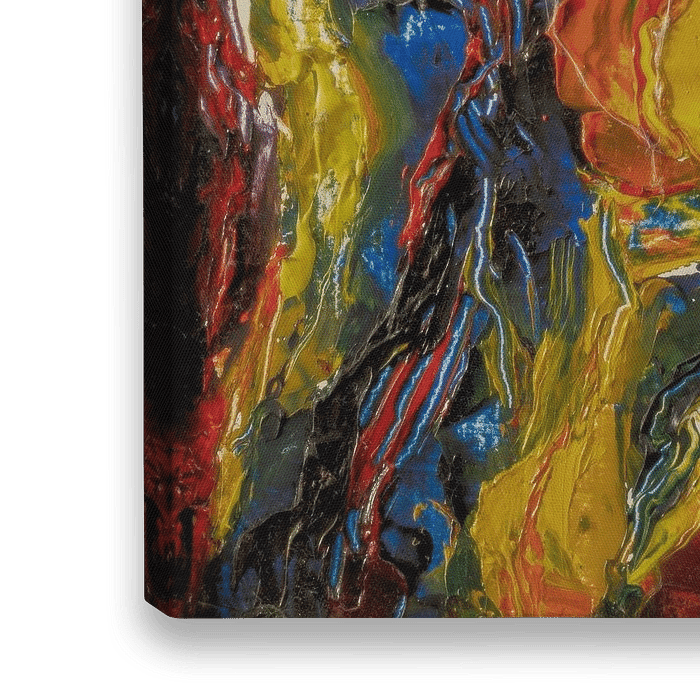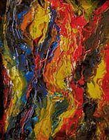 Abstract olieverf schilderij met een dynamische en expressieve stijl. Het toont een wirwar van kleuren en texturen die door elkaar heen vloeien. De kleuren die opvallen zijn felgeel, rood, blauw, zwart en oranje. De verf werd dik en pasteus aangebracht, wat zorgt voor een driedimensionaal effect en een gevoel van beweging en energie.