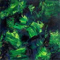 Abstract olieverf schilderij met voornamelijk groene en zwarte tinten. De penseelstreken zijn breed en dynamisch, voor een gevoel van beweging en energie. De groene tinten variëren van licht tot donker, en er zijn ook enkele subtiele accenten van blauw en bruin zichtbaar. De textuur van het schilderij is rijk en gelaagd, voor diepte en complexiteit.