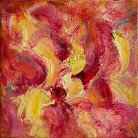 Abstract olieverf schilderij, met een opvallende en levendige compositie. De kleuren die eruit springen zijn rood, roze, geel, oranje en een subtiele hint van blauw. De dikke en expressieve penseelstreken suggereren een sterke dynamiek en beweging, wat het een energieke en intense uitstraling geeft. Het werk straalt een gevoel van passie en kracht uit, met een vleugje speelsheid.