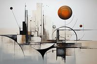 De strakke cirkels, rechthoeken en driehoeken als perfecte geometrische vormen, belichamen een gevoel van orde en precisie. Ze lijken te zweven op het doek in een perfect georkestreerd universum. De vloeiende lijnen tussen deze strakke vormen creëren een gevoel van ritme en harmonie.