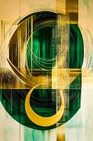 Een prachtig abstract kunstwerk met een verfijnde combinatie van geometrische vormen en rijke kleuren. De diepgroene tinten worden versterkt door de luxe uitstraling van goud, wat een harmonieus en elegant effect creëert. Perfect als een statementstuk in moderne interieurs. Dit ontwerp straalt balans en dynamiek uit, waardoor het zowel…