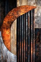 Dit opvallende ontwerp combineert de warme texturen van verweerd metaal en hout in een abstracte geometrische compositie. De halve maanvorm creëert een interessant contrast met de verticale strepen, wat het ontwerp zowel dynamisch als evenwichtig maakt. Het rijke kleurenpalet van roestbruin, koper en zwart geeft een industriële uitstraling, terwijl de texturen van hout een natuurlijke warmte toevoegen. Perfect om een moderne woonkamer, hal of kantoor een kunstzinnige en tijdloze uitstraling te geven.