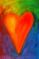 Een helder oranje hart steekt duidelijk af tegen een levendige regenboogachtergrond in gele, groene, blauwe en paarse tinten. De kleuren, geschilderd met losse penseelstreken, creëren een…