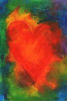 Een helderrood hart steekt af tegen een dynamische, abstracte achtergrond van wervelend groen, blauw, paars en geel, geschilderd met losse penseelstreken. Het levendige kleurenspel creëert een…