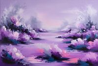 Dit prachtige ontwerp combineert een zachte abstracte stijl met een levendige paarse kleurenschema. Het schilderij toont een fantasierijke landschapsweergave, met florale accenten en een serene waterspiegel. Perfect voor een modern interieur, brengt het een gevoel van rust en stijl in elke ruimte. Ideaal voor slaapkamers of kantoren waar een vleugje verfijnde kleur gewenst is.