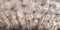 Abstract panorama van druppels op een pluizenbol is een macrofoto van waterdruppels op de pluisjes van een paardenbloem van schuin onderaf gefotografeerd. Deze foto is bewerkt en heeft zwart / wit / bruin / beige tinten.
