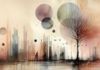 Een illustratie van een stad, abstract, uitgevoerd met inkt, cirkels en een eenzame kale boom. De zachte kleuren van dit aquarel geven het geheel een zachte uitstraling. Het beeld is met behulp van ai gegenereerd.