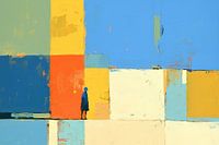 Abstract persoon - In dit abstract schilderij zie je een silhouet van een persoon in een donkere kleur, staande in een kleurrijke omgeving met grote blokken van felgeel, blauw, oranje en groen, wat een modern en speels effect geeft.