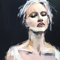 Abstract portret "Just give me the night" van een vrouw in voornamelijk wittinten met rode lippenstift tegen een zwarte achtergrond. Door gebruik te maken van zowel lichte als donkere tinten is er een werk met veel diepte en dynamiek ontstaan. Mooi in ieder formaat!