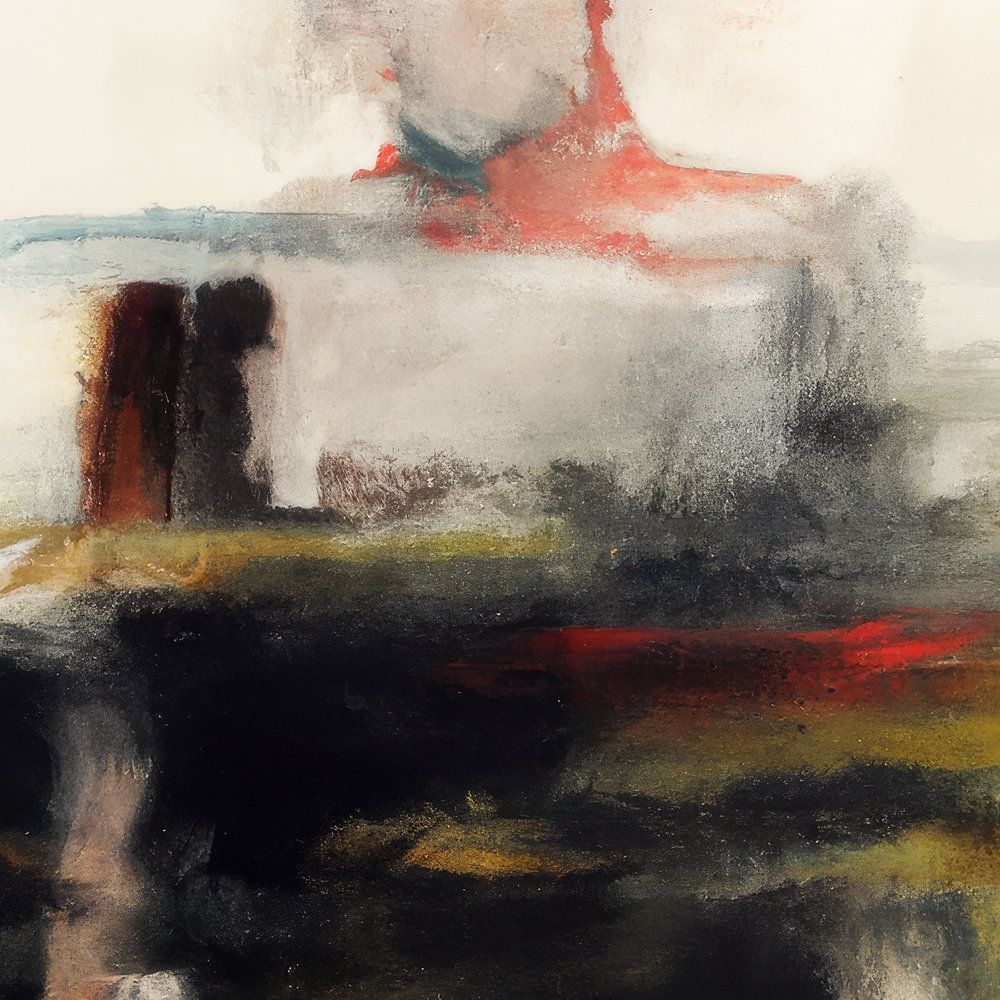 Abstract portret "On my own" in zwart, wit, rood, groen en geel. Asbtracte weergave van een vrouw die door verfstrepen "waadt". Is het water, mist of iets anders? Bij het maken van dit werk heb ik ruimte gelaten voor eigen interpretatie.