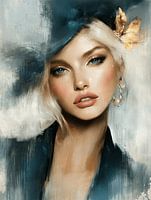 Abstract portret in blauw met gouden accenten. Perfect voor een modern hotel chic interieur. Een bijzondere blikvanger voor je interieur! Kies zelf het formaat en materiaal bij dit werk en maak het helemaal naar wens.