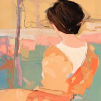Abstract portret van een vrouw, op de rug gezien, in terra en pastelkleuren. Op een abstract werk raak je niet snel uitgekeken, mooi in zowel groot als klein formaat.