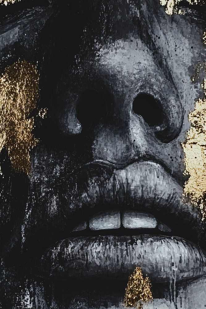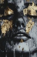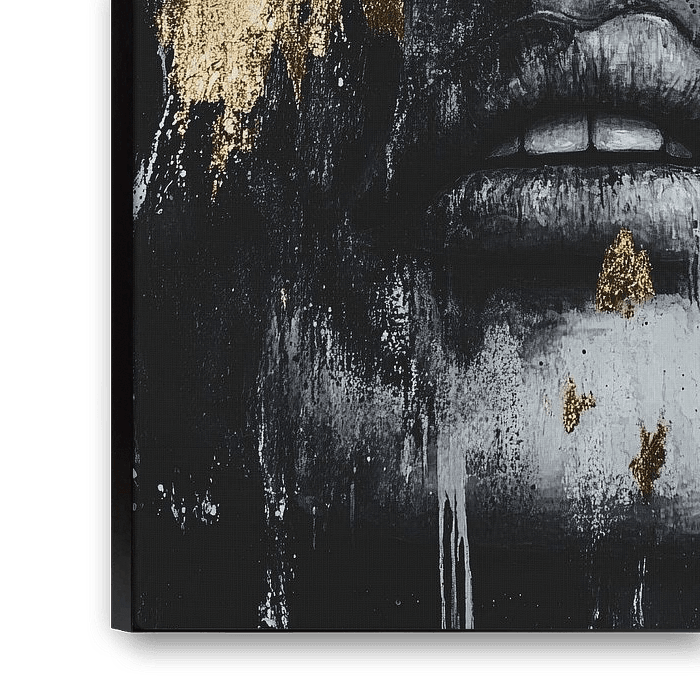 Dit unieke ontwerp toont een abstract portret van een vrouw, waarbij donkere tinten en gouden accenten de aandacht trekken. De combinatie van zwart, grijs en goud zorgt voor een intrigerend contrast en geeft het werk een luxe uitstraling. Het gezicht, gedetailleerd weergegeven, is omringd door gouden vegen die de aandacht vestigen op de ogen en mond, wat het geheel een mysterieuze en intense uitstraling geeft. Dit ontwerp is ideaal voor moderne interieurs, waar het als een echt statement piece kan dienen. Het is zowel krachtig als verfijnd, en past perfect in ruimtes waar kunst gewaardeerd wordt. Hang het op in een kantoor of slaapkamer voor een opvallende en stijlvolle toevoeging.