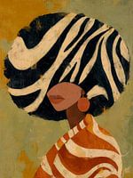 Dit stijlvolle en moderne schilderij toont een vrouw in profiel, met een opvallend grafisch kapsel in zwart en wit. De krachtige lijnen en contrasterende vormen geven het haar een bijna sculpturale uitstraling. Haar gezicht is minimalistisch weergegeven, met zachte vormen en warme tinten die een mooi contrast vormen met het expressieve…