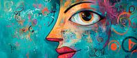 Een krachtig spel van kleuren en vormen vangt de blik van de kijker. Het sierlijke gezicht, omlijst door levendige, abstracte patronen, straalt tegelijkertijd rust en intensiteit uit. Deze compositie geeft elke ruimte, vooral de woonkamer, een fascinerende sfeer die uitnodigt om te dromen en na te denken.