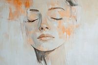 Een sfeervol en dromerig kunstwerk dat rust en elegantie uitstraalt. Dit abstracte portret van een vrouw met gesloten ogen is geschilderd met zachte penseelstreken en een subtiele mix van warme en neutrale tinten. De combinatie van oranje accenten en gedempte kleuren creëert een harmonieuze uitstraling, perfect voor een serene en stijlvolle interieursetting. Dit kunstwerk past goed in een minimalistisch, modern of bohemien interieur en brengt een gevoel van rust en verfijning in elke ruimte. Een ideale keuze voor wie op zoek is naar een tijdloos en expressief schilderij dat zowel emotie als esthetiek overbrengt.