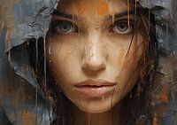 Dit licht abstracte werk creëert een zwevende melodie in het portret van een jonge vrouw. Haar blauwe ogen dragen een zuivere onschuld in hun diepte. De penseelstreken weven een delicate compositie, waarbij het lichte abstracte spel van licht en kleur een sensuele gloed toevoegt. Het geheel straalt een poëtische tederheid uit, waarbij de vrouw als een harmonieus akkoord van onschuld en subtiel verleidelijke schoonheid verschijnt.