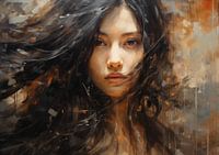Dit werk vangt de betoverende blik van een jonge vrouw met donker haar, waarbij de diepte van haar ogen de toeschouwer direct aankijkt. Haar donkere lokken lijken te dansen in de wind, een elegante beweging die de kracht en dynamiek van de vrouw benadrukt. De ogen, doorgrondend en vol wijsheid, geven het portret een diepere dimensie.…
