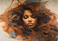 Dit licht abstracte werk vangt het moment waarop een mooie, jonge, Afrikaanse vrouw, afgebeeld in een zacht portret, in harmonie lijkt te dansen met de wind. Haar donkere haar, wild en vrij, lijkt te zweven als een dansende schaduw in de lichte bries. Het spel van licht en schaduw schildert een gevoel van vrijheid, waarbij de lichte abstractie een dromerige sfeer toevoegt aan het portret. Het geheel ademt een luchtige elegantie uit, waarbij de dans van het haar en de doordringende blik van de ogen een verhaal vertellen van kracht en vrijheid.