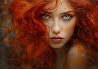 Dit licht abstracte werk vangt de vurige vrijmoedigheid in de blauwe ogen van een jonge roodharige vrouw. Haar krullende haar lijkt te flakkeren als vlammen, met de intensiteit van de kleur die diepte geeft aan het portret. De blauwe ogen, vol van levendige expressie, stralen een sensuele vastberadenheid uit. Het subtiele gebruik van licht voegt een zachte glans toe aan het geheel, waarbij de vurige elementen van het portret worden verzacht door de rustige blauwe ogen. Het geheel straalt een krachtige, sensuele vrijmoedigheid uit, waarbij de roodharige vrouw op een zelfbewuste en aantrekkelijke manier wordt geportretteerd.