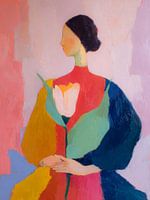 Dit abstracte portret vangt de vrouwelijke elegantie op een speelse en expressieve manier. De vrouw staat in profiel, haar gezicht is subtiel en minimalistisch weergegeven, met slechts hints van haar gezichtskenmerken. Haar kleurrijke jurk bestaat uit grote blokken van levendige tinten: rood, geel, groen en blauw, die een gevoel van beweging en energie oproepen. In haar handen houdt ze een grote bloem, die met zijn zachte wit en groene bladeren het enige rustige element in de compositie vormt. De zachte penseelstreken en de rijke texturen geven het werk een dynamisch gevoel, waarbij de kleuren elkaar aanvullen en de energie van het moment vastleggen. Het contrast tussen de geometrische vormen en de organische bloem creëert een intrigerende balans tussen structuur en vrijheid.