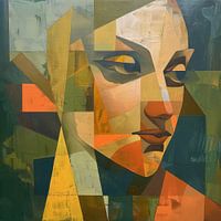 Dit indrukwekkende schilderij toont een abstract portret van een vrouw dat fascineert door de warme aardetinten en geometrische vormen. De harmonieuze combinatie van groene, bruine en oranje tinten geeft het schilderij een rustgevende maar intrigerende uitstraling. Dit kunstwerk is ideaal voor moderne woonruimtes of kantoren en biedt een elegante en dynamische aanvulling op het interieurontwerp. De precieze lijnen en diepe kleuren maken dit stuk een blikvanger voor kunstliefhebbers die op zoek zijn naar een uniek en stijlvol kunstwerk.