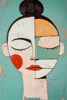 Een harmonieus samenspel van zachte kleuren en geometrische vormen komt de kamer binnen. De kalme ogen en zachte gezichtsuitdrukking nodigen uit om te ontspannen. Dit kunstwerk, ideaal voor in de woonkamer, vult de gezellige sfeer aan en zet tegelijkertijd aan tot nadenken. Een echte blikvanger met een vleugje kunst en rust!