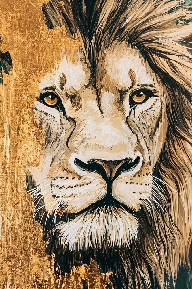 Dit unieke ontwerp toont een imposante leeuw, subtiel weergegeven op een abstracte achtergrond met groene en gouden tinten. De intense blik van de leeuw trekt meteen de aandacht en brengt een gevoel van kracht en elegantie naar voren. De combinatie van de realistische leeuwenkop met een abstracte, goudkleurige achtergrond maakt dit kunstwerk perfect voor een moderne woonkamer of kantoorruimte. De gouden accenten voegen een vleugje luxe toe, terwijl de groene tinten voor een natuurlijke balans zorgen. Ideaal voor liefhebbers van dieren en moderne kunst, dit ontwerp past in een stijlvol interieur en creëert een krachtig visueel statement.